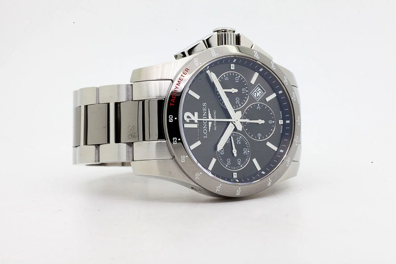 Основные характеристики: • Бренд: Longines • Коллекция: Conquest Classic (спорт/элегантность)  • Тип механизма: автоматический (механический с автоподзаводом)  • Диаметр корпуса: 41 мм, толщина около 14 мм  • Материал: нержавеющая сталь с керамическими элементами (бежевый/серый керамический безель и вставки в браслете)  • Циферблат: серый с люминесцентными стрелками и индексами, 12‑часовая отметка цифрой, тахиметр по безелю  • Стекло: сапфировое, устойчивое к царапинам  • Браслет: сталь с керамическими вставками, фиксируется раскладывающейся застёжкой  • Водозащита: 50 м / 5 ATM (~165 футов) — выдерживает брызги и лёгкое плавание